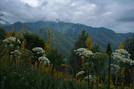 Landscape with poisonous plant Hogweed against the background of gloomy mountains in summer, Kumbel peak, Zailiysky Alatau in Kazakhstan Almaty.