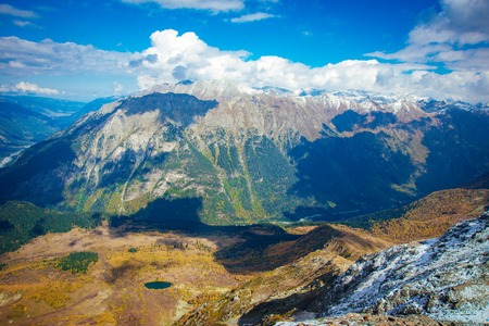 The mountain autumn landscape with colorful forest and high peaks Caucasus Mountains
