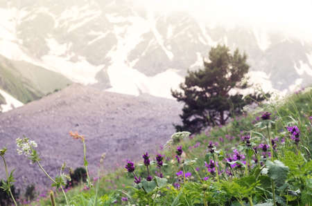 Spectacular view on Caucasus mountains. Plants and rocks in foreground and peaks covered with snow out of focus in background
