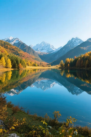 Beautiful autumn alpine landscape with lake and mountains reflected in water