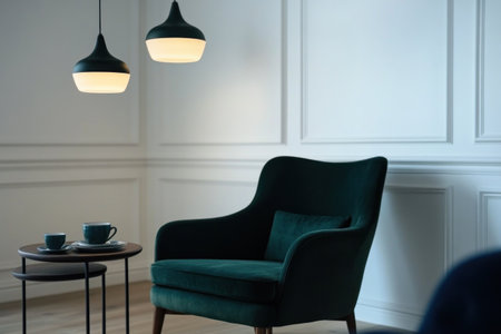 Modern living room with a dark green armchair and a table against a white wall, simple interior design with hanging lamps, close-up of a coffee set on side tables in a minimalist home decor. --ar 3:2 --v 6.1 Job ID: d32d3454-5410-42b2-886c-7ce858b309c6