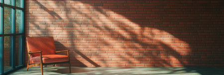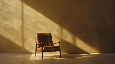 A vintage leather armchair sits elegantly against a minimalist backdrop, illuminated by natural sunlight, casting intriguing shadows that enhance the serene atmosphere.