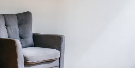 Grey armchair in living room with white wall and copy space.