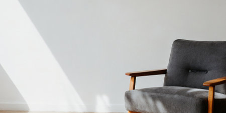 grey armchair in the room with white wall and shadow from window