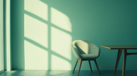 A serene interior scene showcasing a stylish chair and table on a light blue wall, accentuated by gentle shadows and warm sunlight, creating a calming atmosphere.