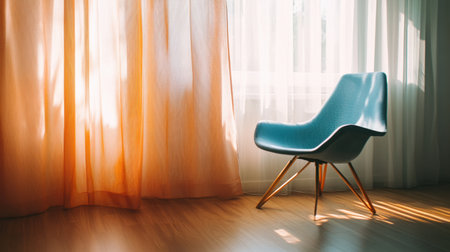 This image showcases a modern blue chair beside soft orange curtains in a sunlit room, creating a tranquil and inviting atmosphere perfect for relaxation.