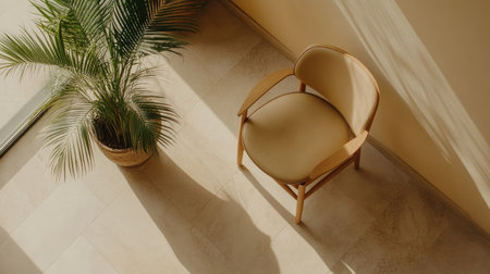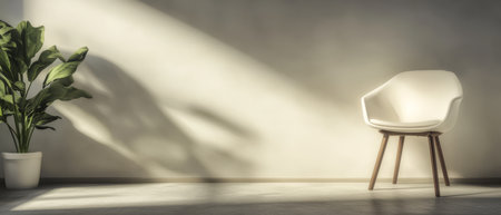 Bright sunlight streams through a window illuminating a simple white chair and a lush green plant in a minimalistic setting. Shadows create an inviting atmosphere on the wall.