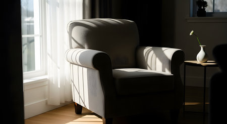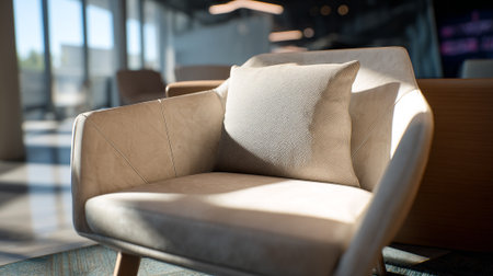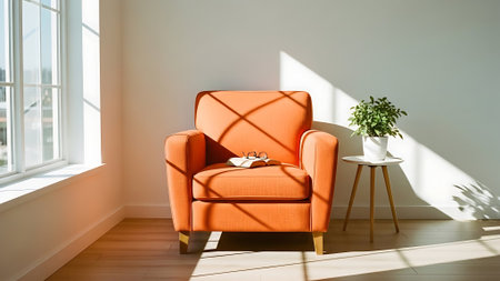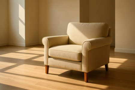 Comfortable beige armchair basking in sunlight in a modern, minimalist living room, creating a warm and inviting atmosphere