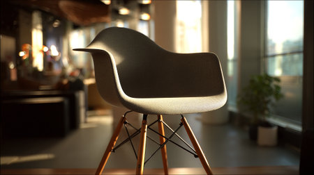 An empty modern chair sits on a wooden floor, bathed in the soft light of dawn from a large window.