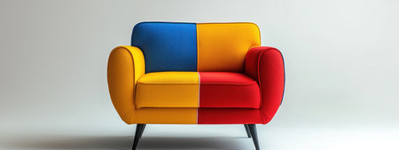 A modern armchair inspired by Bauhaus design, featuring bold primary colors of red, yellow, and blue with minimalist aesthetic