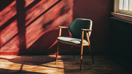 A solitary vintage wooden chair illuminated by warm sunlight, set against a textured wall for a timeless scene.