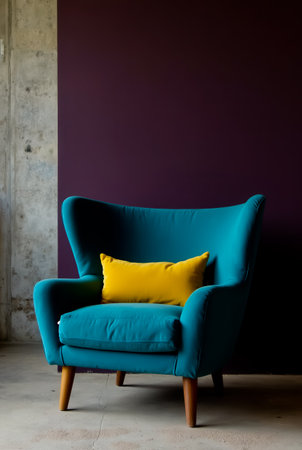 A blue armchair with a yellow pillow on a purple wall