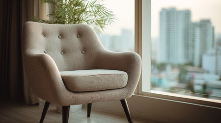 Modern armchair beige fabric living room window view cityscape indoor plant cozy seating natural light wooden floor
