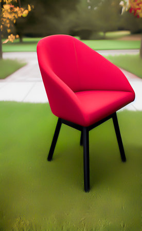 Red armchair on the green grass in the garden, soft focus