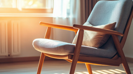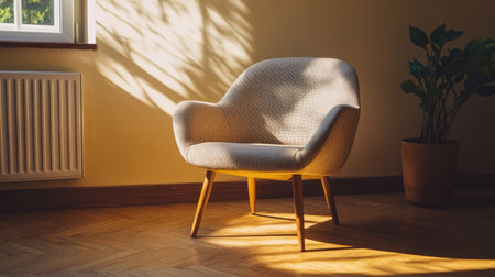 A stylish mid-century modern chair with wooden legs and a soft fabric seat, placed in a sunlit corner of a room.
