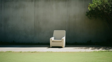 a lawn chair sits isolated in a minimalist brutalist setting, its simplicity emphasized by the clean lines and empty space surrounding it, captured in exquisite detail using a mamiya rz67 camera with a zoom lens, evoking a sense of serenity and modernist aesthetics. ai generated
