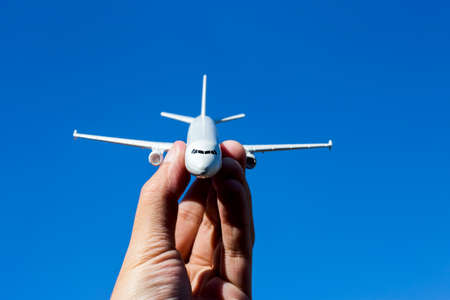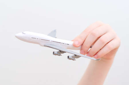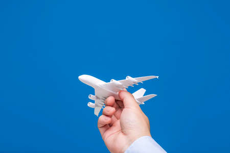 Hand holding airplane model. Travel