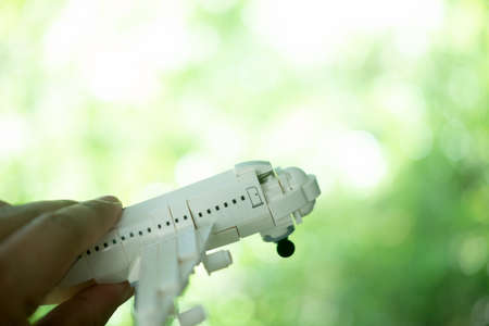 Man hand flying toy plane against blur green background. Concept of travel