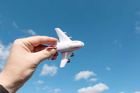 Airplane model in hand on sunny sky. Concepts of travel, transportation, transport, dreaming about holidays