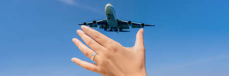 Female hand with a ring with a drawn plane holding a plane flying in the sky. Traveling on an airplane concept. Text space. Impressive paradise. Hot beach Mai Khao. Amazing landscape BANNER, LONG FORMAT