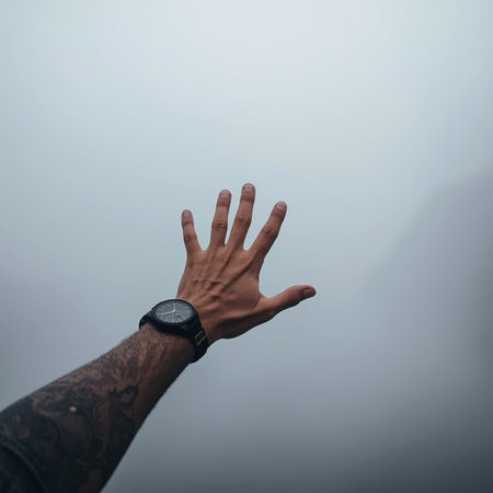 This is a shot of a hand reaching out against a foggy background.
