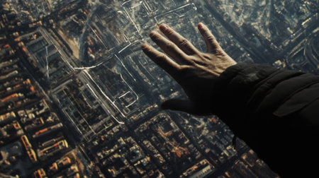 A closeup view captures the politicians hand resting on the glass finger tracing the outline of the cit