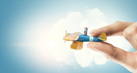 Toy airplane in hand on sky background
