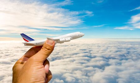 Airplane model in hand on sunny sky. Concepts of travel, transportation