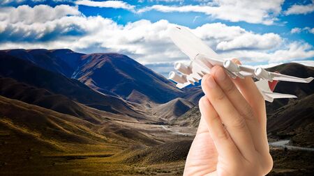 Woman Hand holding mini airplane model with on beautiful mountain scenery background,tourism or travel concept