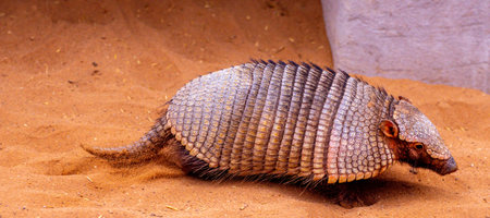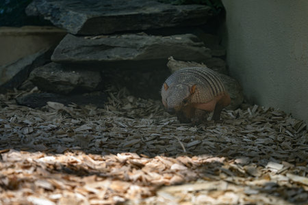 An Armadillo Animal Running Around In An Enclosure At A Zoo. The Armadillo enjoying running in the soft sand.