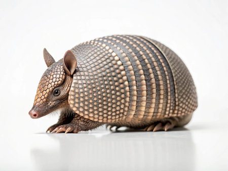Rear side of nine banded Armadillo aka Dasypus novemcinctus, walking away. tail hanging laying to the side. Isolated on a white background.