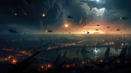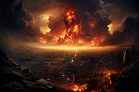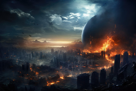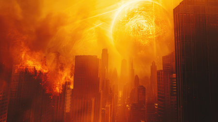 A horrifying scene captured as flickering flames consume an entire city, shrouding it in darkness, The end of planet Earth, AI Generated