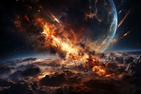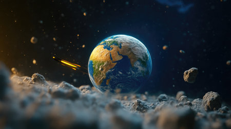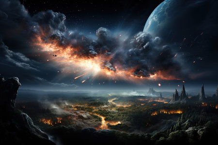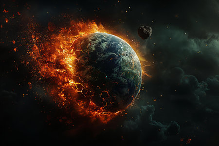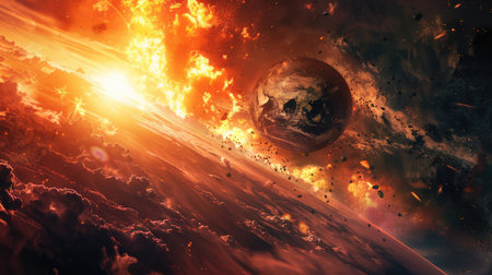 Apocalyptic scene of asteroid approaching Earth, cosmic impact, fiery comets, burning atmosphere, and global chaos concept