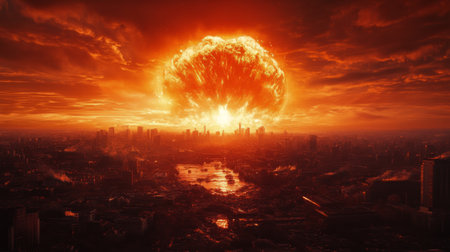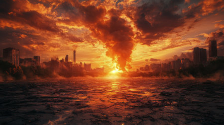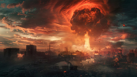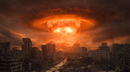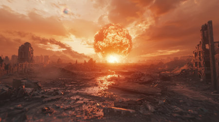 A massive explosion engulfs a city skyline, resulting in widespread destruction and an eerie atmosphere. Debris fills the air as fire and smoke rises ominously from the ground. The sky is colored with hues of orange and red, highlighting the chaos and devastation caused by nuclear weapons. The scene conveys the profound threat of nuclear war on civilization.