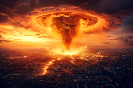 Nuclear explosion in a big city. Fire mushroom cloud. Atomic bomb blast. Apocalypse, world war.