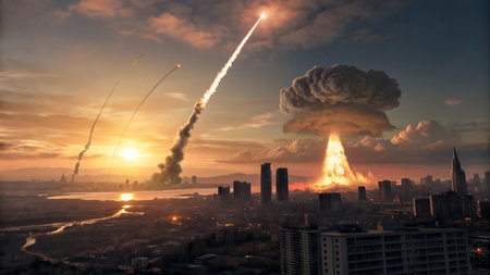 A dramatic digital depiction of a city under intense missile attack, resulting in a massive nuclear-like explosion with a mushroom cloud. This artwork portrays urban devastation and warfare.