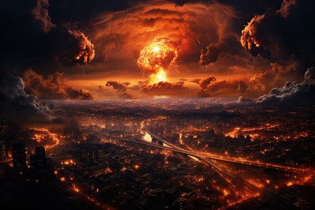 A spectacular nuclear explosion erupts in the night sky above a city, its fiery plumes creating a stark contrast against the urban skyline