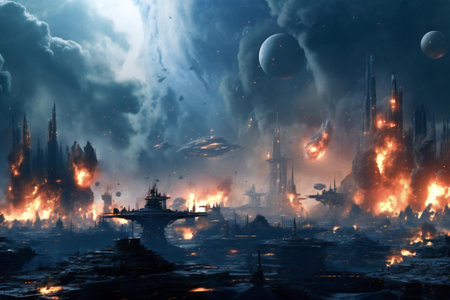 A dramatic and apocalyptic of Planet Earth with a focus on Europe, depicted in a state of war or catastrophe. City lights glow brightly, but the planet is surrounded by explosions, fire, space debris, suggesting a major global conflict or disaster