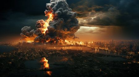 Huge explosion in the middle of the city with a lot of smoke coming out of it. Generative AI.