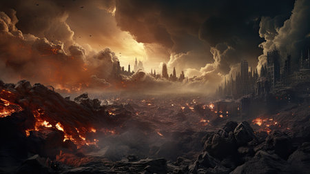 An urban area veiled in heavy smoke, releasing significant amounts of harmful pollutants into the air, World collapse, doomsday scene depicted in a digital painting, AI Generated