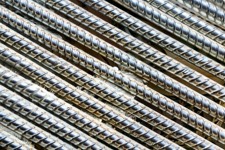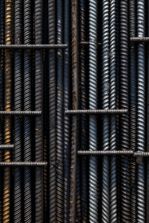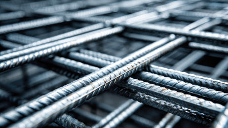 A detailed close-up of steel rebar showcasing its textured surface and intricate grid design, ideal for construction, engineering, and architectural projects.