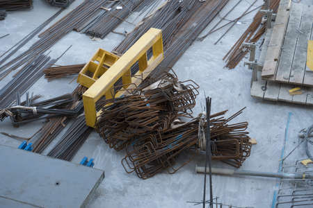 Close up on the construction armature iron frames on the other building material at the construction site in sunny day