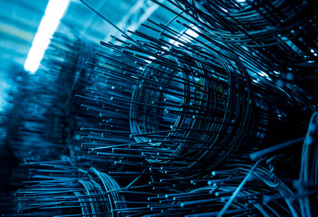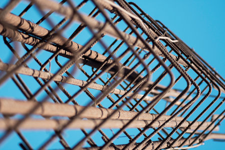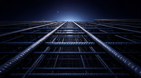 Intricate details of reinforced steel bars reflect the artistry of construction. The interplay of light and shadow emphasizes the strength and durability needed for structural integrity.