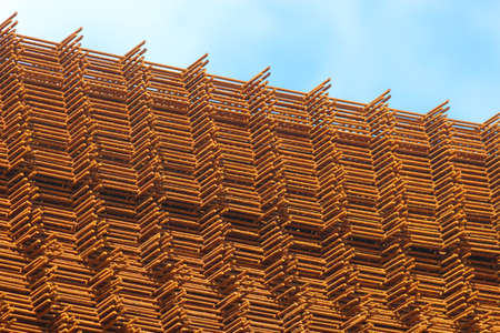 Crossing reinforcement bars connected by welding in a metal structure against a blue sky, Close up. Industrial background. metalwork, construction rebar, reinforcing steel, concrete reinforcement,