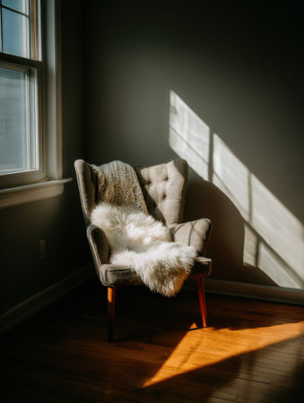 A soft armchair is adorned with a faux fur throw, basking in warm sunlight streaming through a window, creating a peaceful atmosphere.