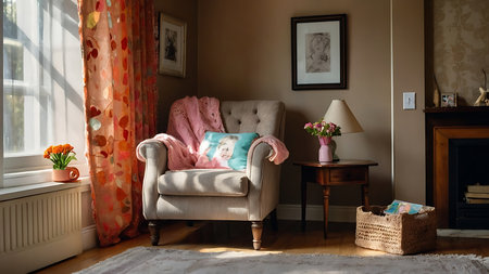 Cozy reading nook with soft armchair sunlight filtering through sheer curtains peaceful and serene atmosphere close-up capture