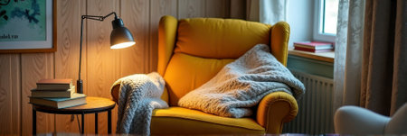 Cozy reading nook with yellow armchair and soft blanket by window. That the image is generated using AI.