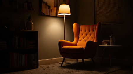 An inviting interior scene features an orange armchair illuminated by a standing lamp. Warm lighting casts soft shadows across the room, highlighting the textures of the furniture and wall art. The composition suggests a relaxed atmosphere, suitable for editorial or commercial applications. The scene provides a sense of comfort.