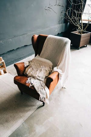 Cozy leather armchair with knitted blankets and cushions in warm living room setting. That the image is generated using AI.