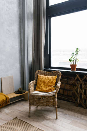 Wicker chair with yellow cushion, cute interior. Cozy house. Interior design of the Scandinavian living room